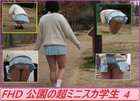 かなり短いスカートから伸びるすらっとした美脚...。そこから覗く純白パンチュ...。パンツ丸見えのまま公園で一人遊び...。