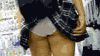 スカートの裾を押さえて必死に抵抗するが、それでも負けずにスカートをペロリとめくってやったぞ!!